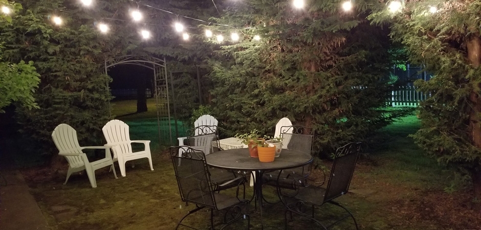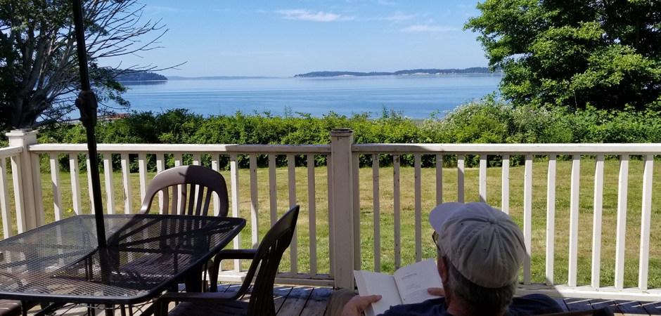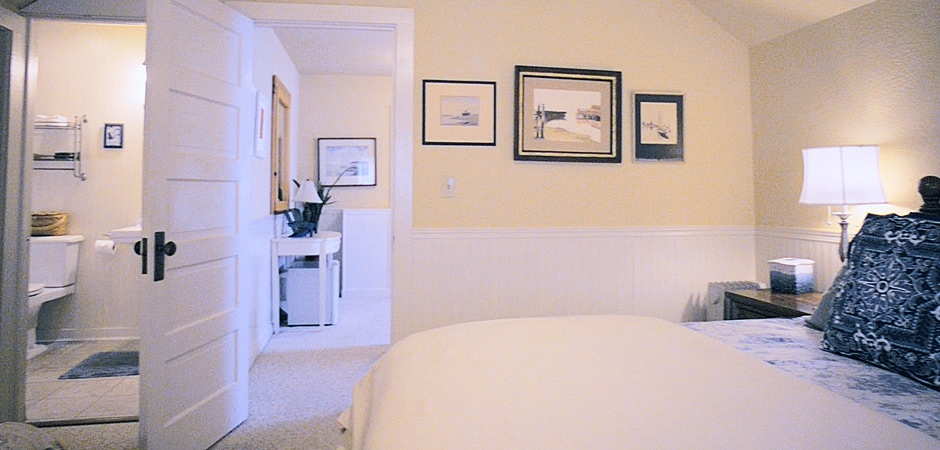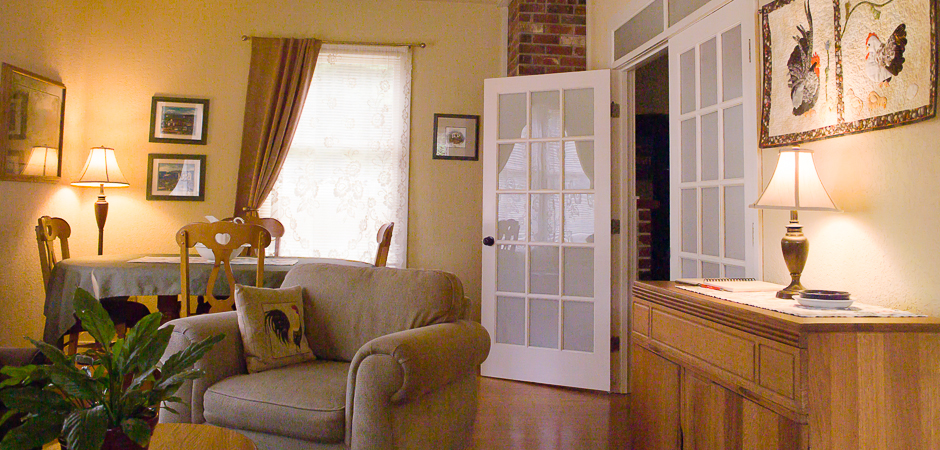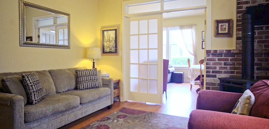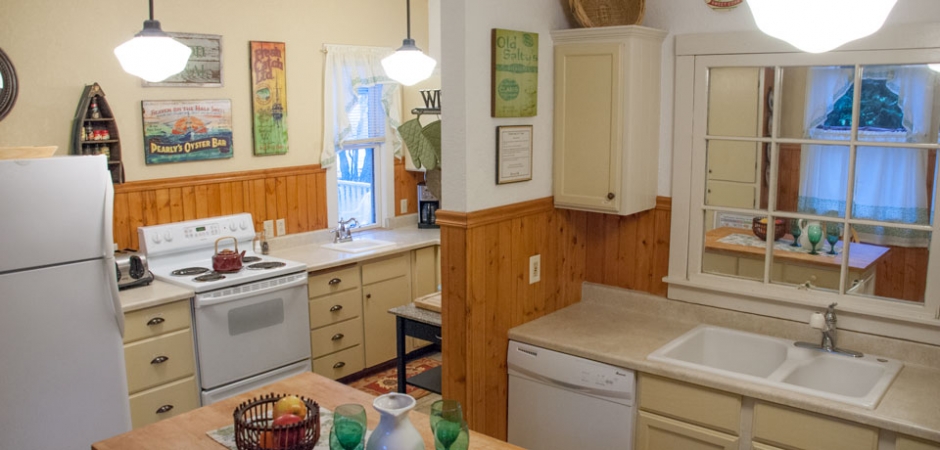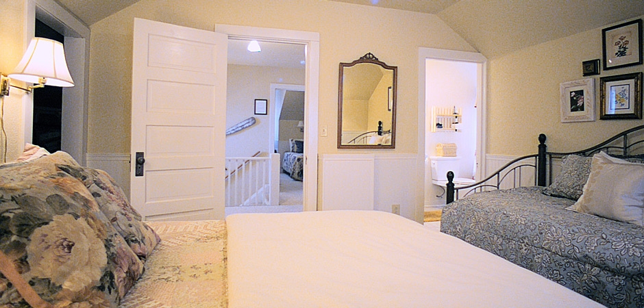 This distinguished, old home (the green house) has three comfortable bedrooms each with their own full bath, two sleeper sofas and can sleep up to ten people. It features a large, fully stocked kitchen, dining room and living room with a fireplace. The living room can be closed off to create a private suite for guests who desire even more spacious surroundings.